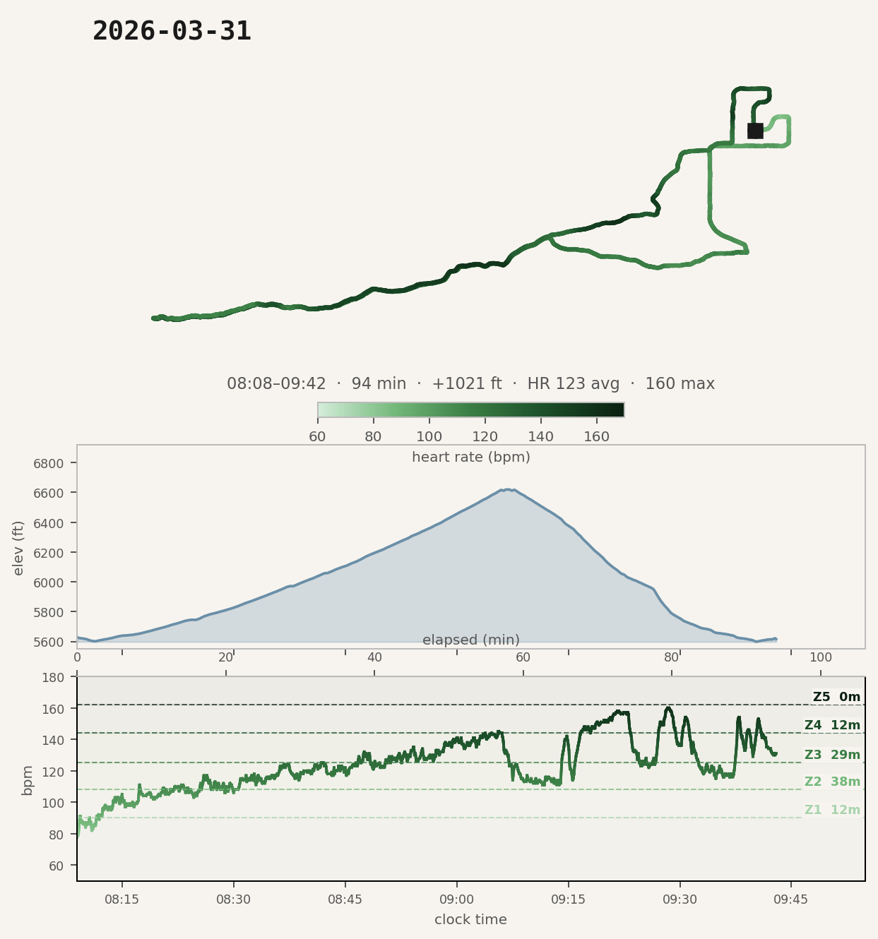 Went on a hike this morning then vibe coded a map making script that puts together gpx and heart rate data.